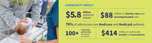 Hospitals are integral to the communities they serve, far above and beyond the health care they provide: educational programs, promoting healthier lifestyles, outreach to the underserved. As a large, mission-driven organization, the System also supports local organizations, partners with schools and nonprofit groups, and builds key connections to improve the wellbeing of our region and enhance the everyday lives of the three million who live here.