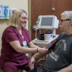 A medical professional stands in a scrub top pasted over text that reads Walk-In Wednesdays