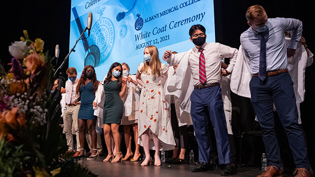 After an unprecedented year of interviews and campus tours and classes that the Covid-19 pandemic forced to be virtual, members of the Albany Medical College classes of 2024 and 2025 finally donned their white coats for the first time Thursday. The white coat is a symbol of the trust bestowed upon students as they enter the medical profession.