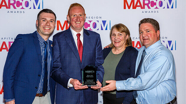 The Albany Med Health System Communications and Marketing Department was honored with a first-place award for its brand launch and image campaign by the American Marketing Association and Public Relations Society of America Capital Region chapters. The two organizations presented their joint MARCOM awards during a ceremony in Troy on Feb. 9.