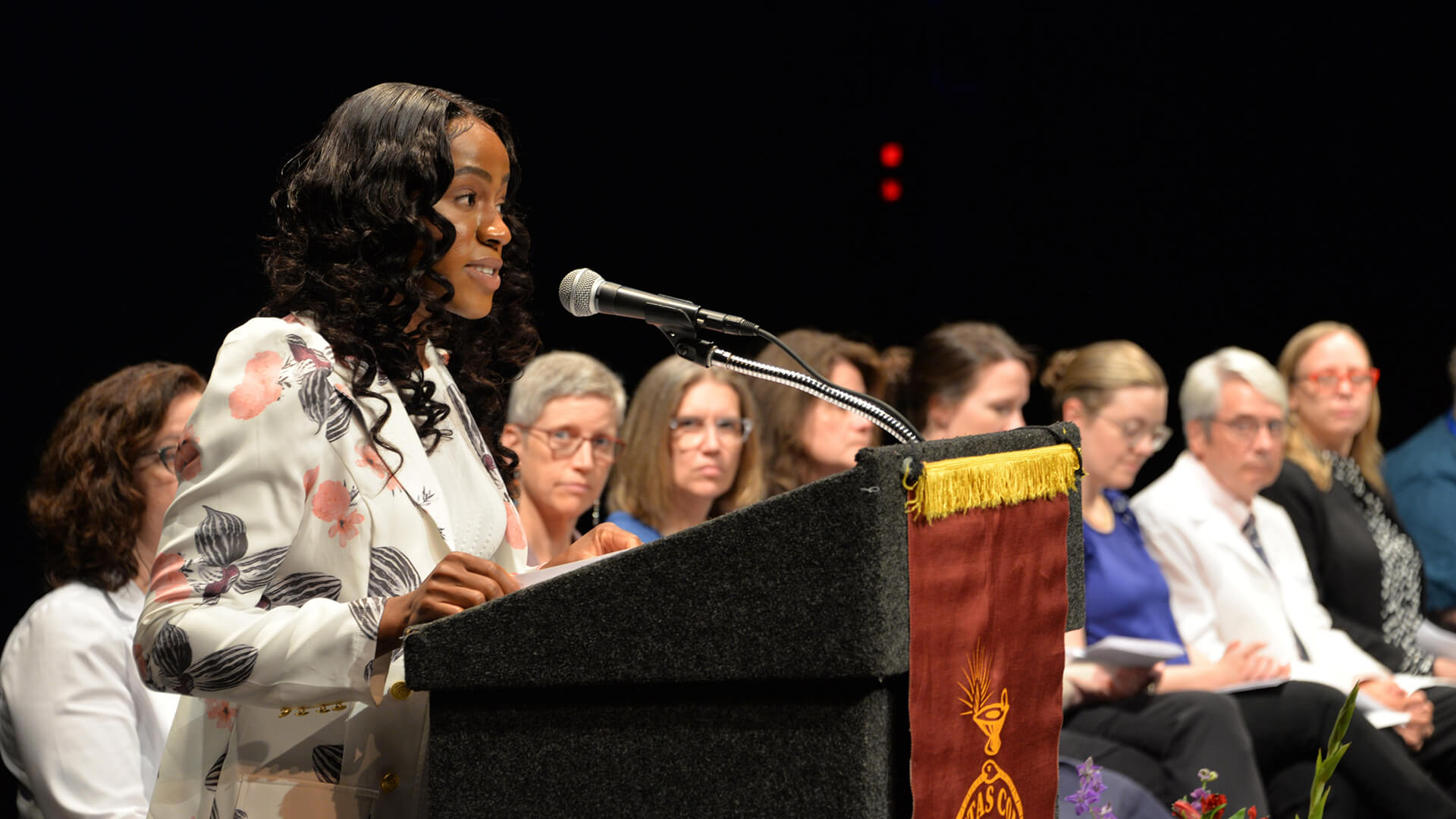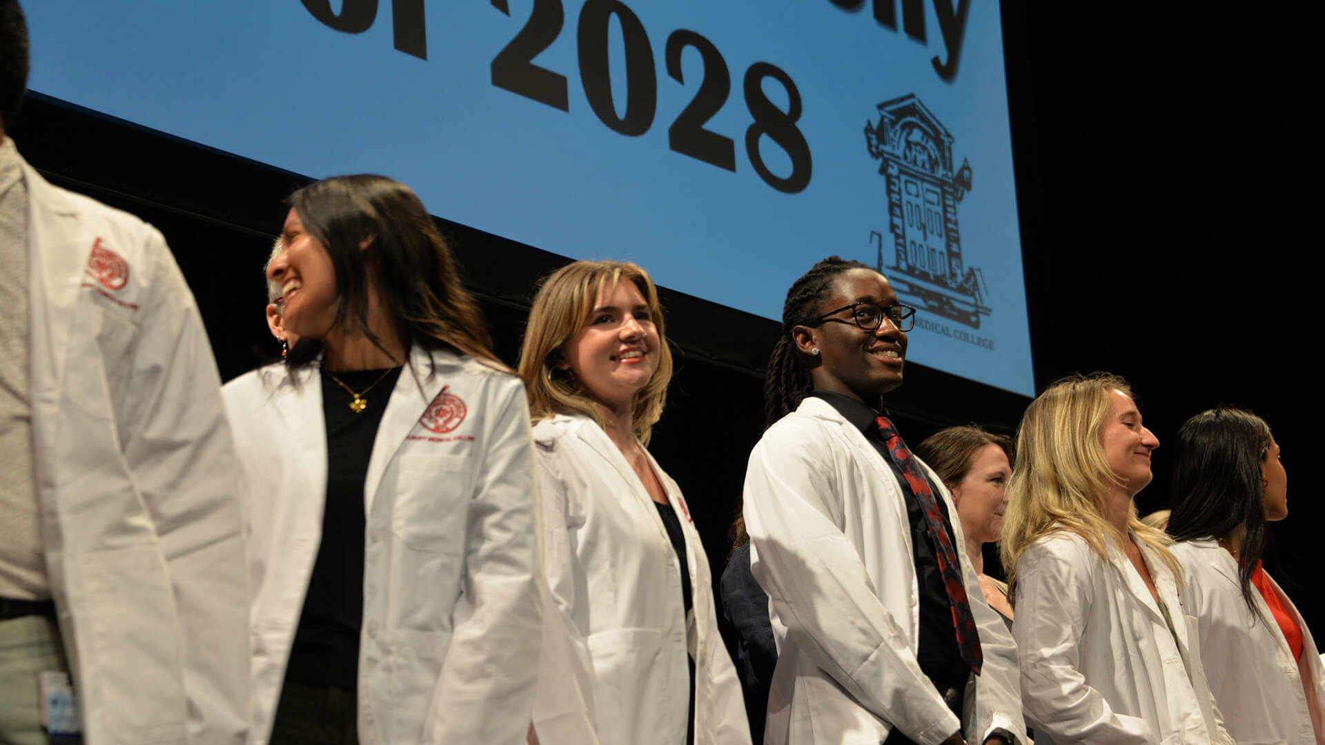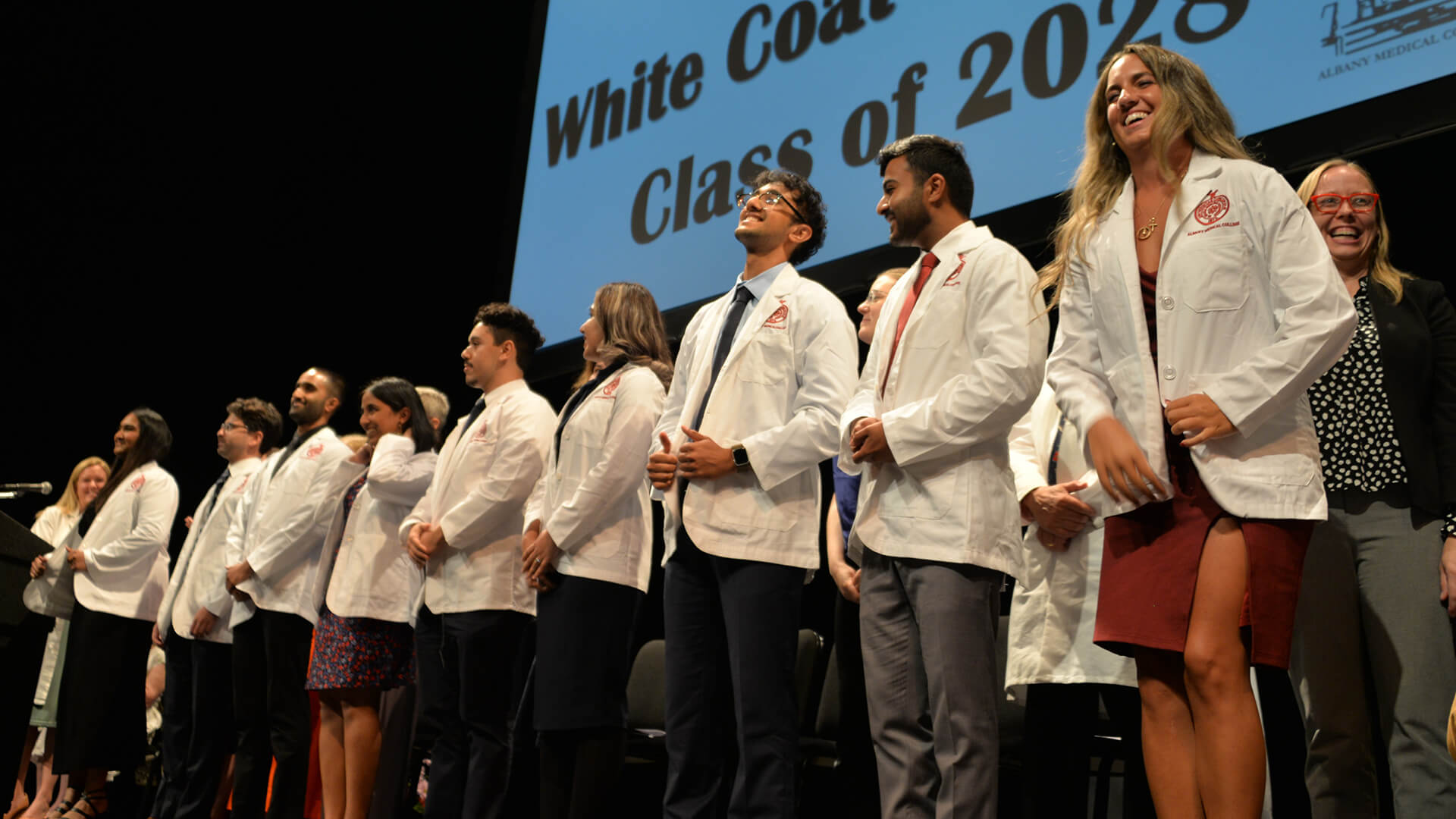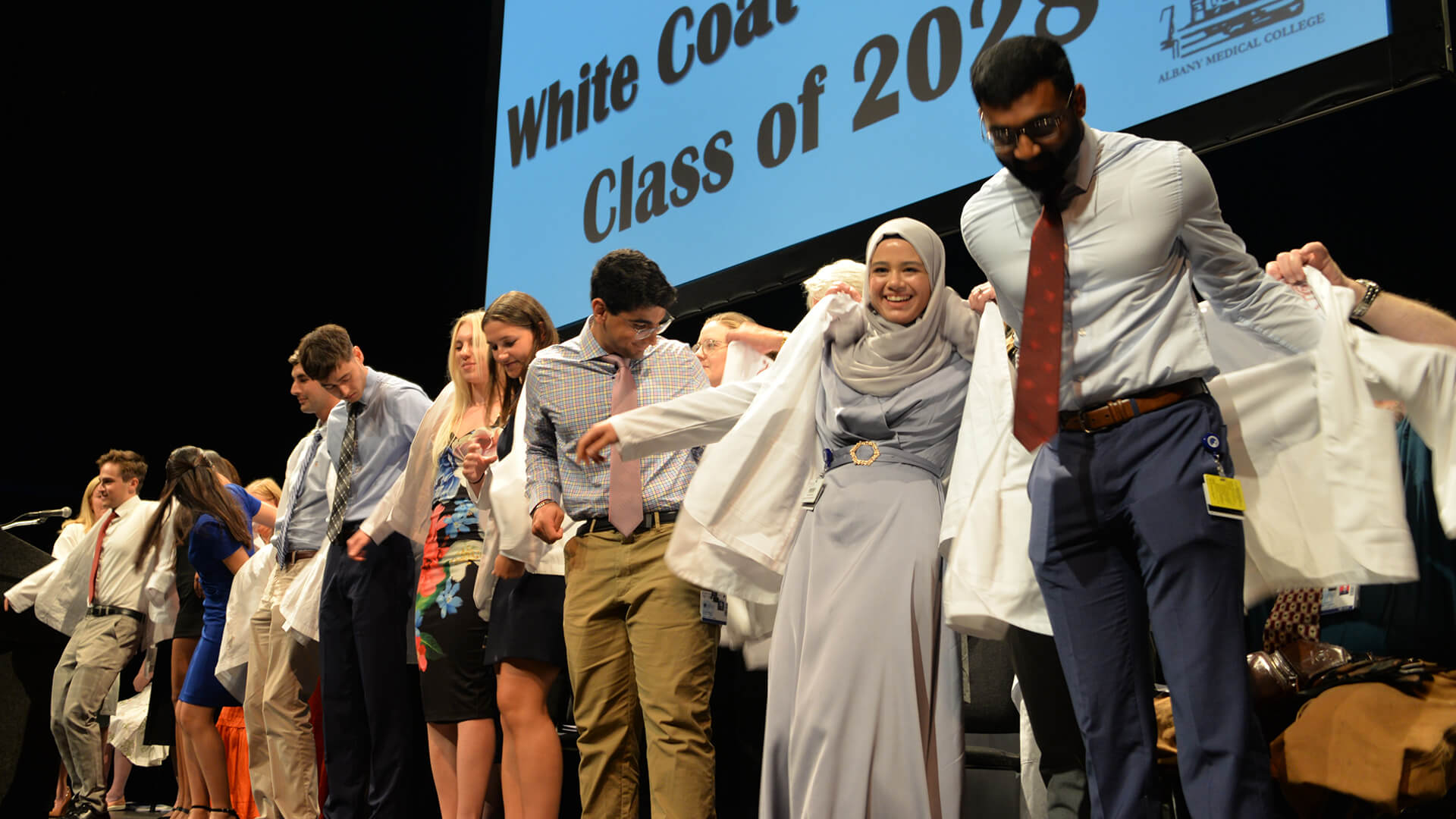 Albany Medical College celebrated its White Coat Ceremony today with 145 incoming medical students, their friends, and families at the Kitty Carlisle Hart Theatre in The Egg at the Empire State Plaza. In addition to donning their symbolic white coats for the first time, students also recited the Declaration of Geneva, a modern-day physician’s oath.
