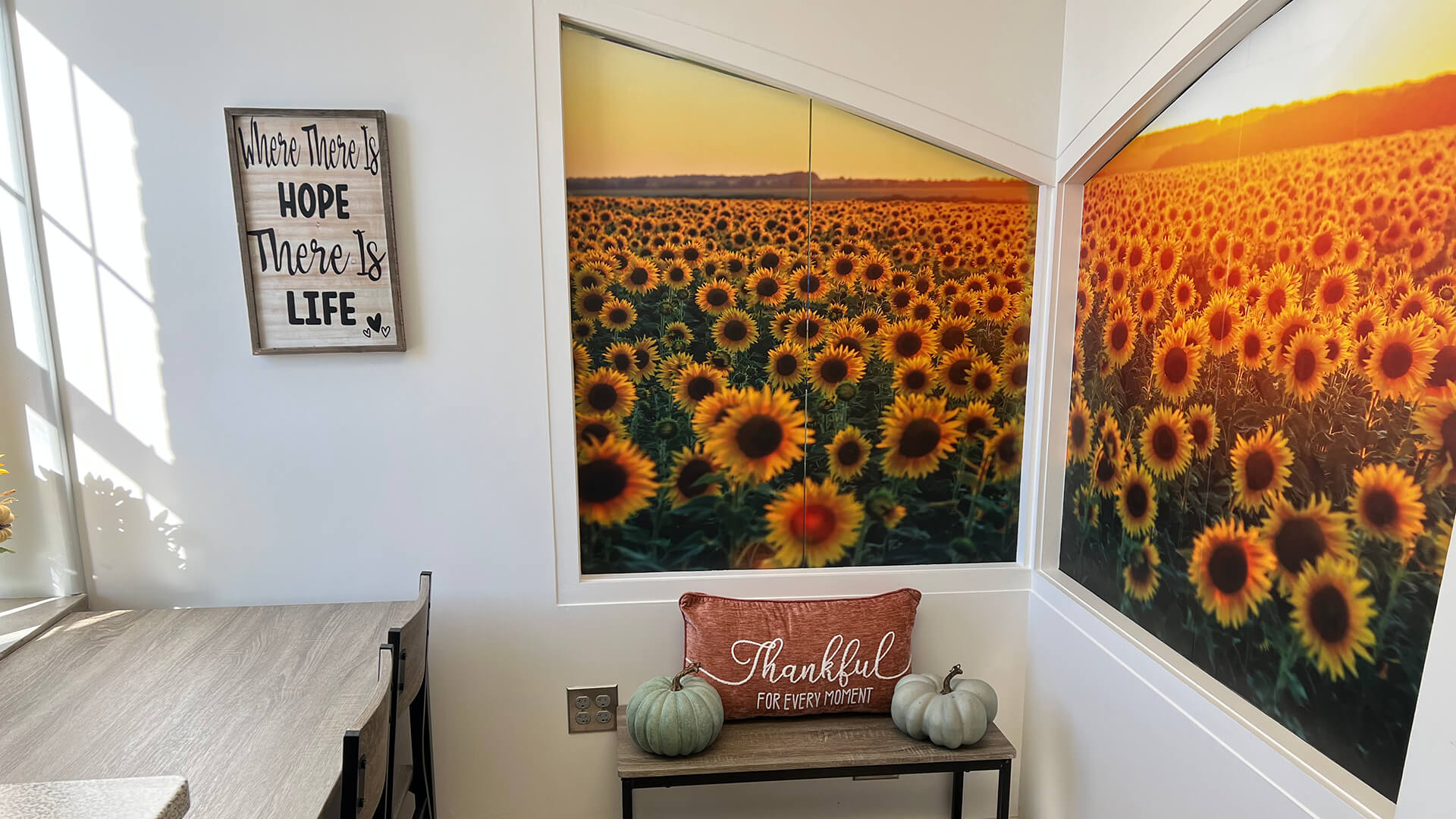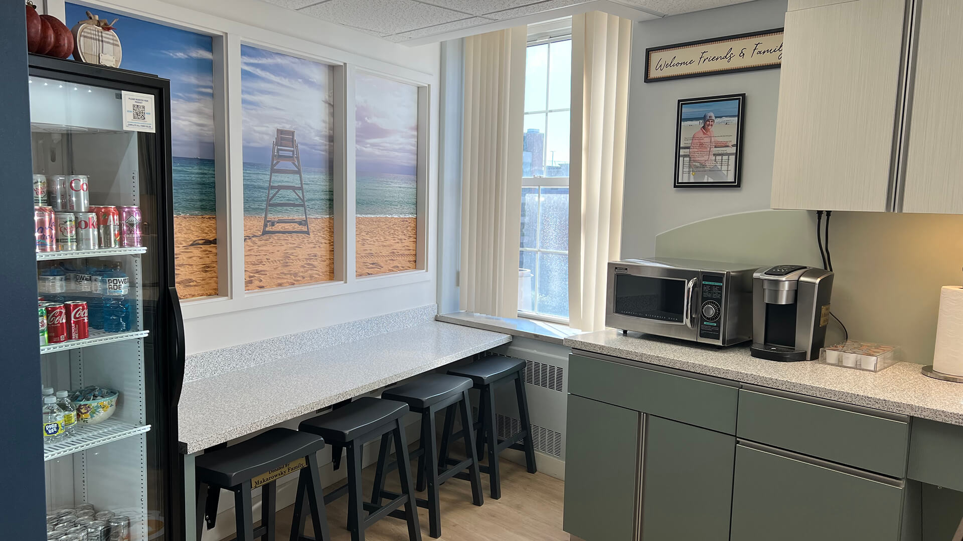 A picture of Hannah welcomes visitors at the door to the kitchen. The refrigerator is full of water and juice, the cabinets are full of snacks, and there’s a coffee pot, per Hannah’s request. The room is decorated with pictures of sunflowers and the beach - Hannah’s favorites.
